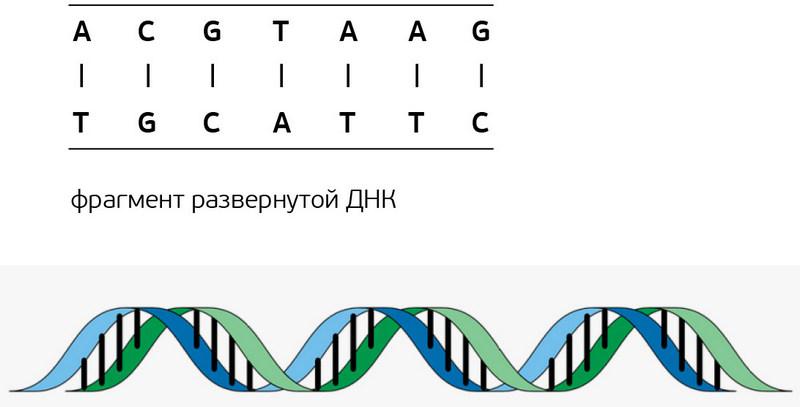 Генетическая информация. Основная информация о строении клетки в частности и организма в целом содержится в ДНК – очень длинной молекуле дезоксирибонуклеиновой кислоты, состоящей, как правило, из двух изогнутых относительно друг друга цепочек (так называемая двойная спираль). Каждая цепочка состоит из повторяющихся блоков – нуклеотидов. Одни части нуклеотидов связаны между собой и образуют каркас цепочки, а другие части – азотистые основания – связаны с азотистыми основаниями другой цепи. Всего таких оснований четыре: аденин (A), гуанин (G), тимин (T) и цитозин (C). А соединяется с Т, а G – с C. Отдельные фрагменты ДНК называются генами, и в них кодируется информация о различных признаках организма и клетки.