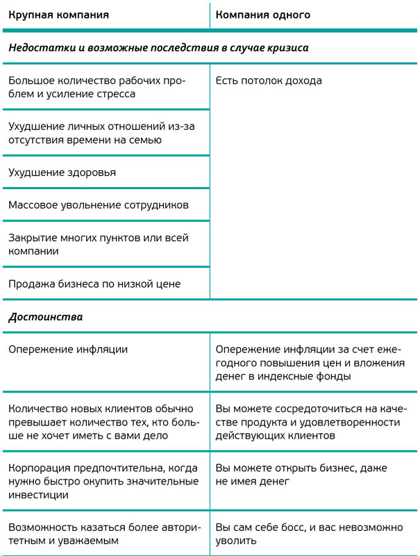 Компания одного начинает с малого (один человек, без офиса) и допускает расходы только после того, как получит прибыль. Рост идет медленно и постепенно: небольшая прибыль ведет к небольшим тратам, что постепенно повышает доходы, а затем незначительно повышает расходы и т. д. Со временем владелец может выбирать: расти, оставаться неизменным, больше отдыхать, масштабировать системы – у нас есть все эти возможности, потому что наша цель не предполагает роста прибыли; мы просто хотим зарабатывать больше, чем тратим.