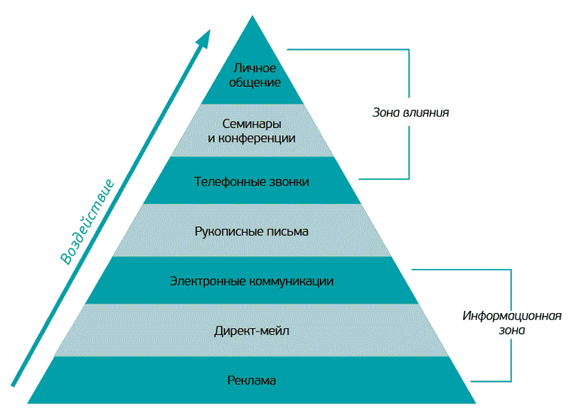 Чтобы верно распределить свои усилия, нужно перестать тратить деньги и время на нижнюю часть коммуникационной пирамиды: эффективность рекламы, директ-мейла и писем по электронной почте очень невелика. Если ваш бизнес относится к сфере, которая задевает самые личные аспекты (семья, деньги, здоровье), отклик в нижней части пирамиды будет вообще исчезающе мал по сравнению с тем, что могут дать инструменты «зоны влияния».