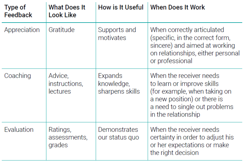 Feedback types are mixed. All types of feedback are needed, however each of them works separately. If you decide to express gratitude to someone, you should not give advice at the same time – this will devalue your appreciation. If in your organization formal assessments are customary, do not conduct them during a coaching session – the assessment should come first. It is important for us to know what our status is, only then are we ready to receive instruction.