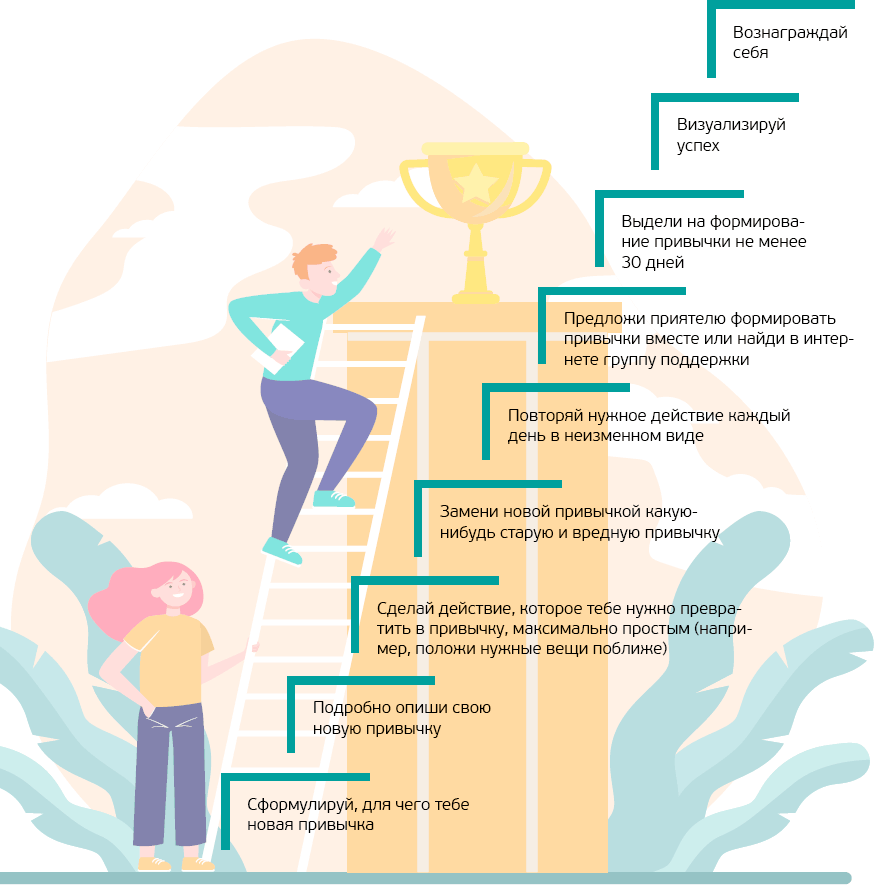 Как создать привычкуФормирование привычки состоит из последовательности шагов. Думай о них как о ступенях лестницы, по которой ты поднимешься на новую высоту.