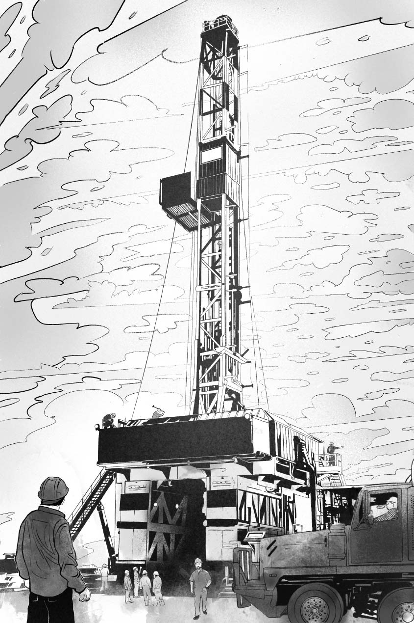 No one was even drilling for oil yet. Everything I saw out the window—the trucks, the cranes, the men—was there because a previous well had been drilled to completion. And so we had shown up, Diamondback Trucking, to take the rig—the mechanism that extracts oil from the well—apart and load it onto haul trucks to bring it here, to a new location, where it was being reassembled over a new drill hole.