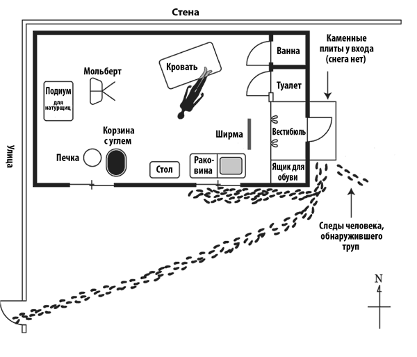 Когда женщины проникли в мастерскую, уголь в печи еще тлел. В то время публика зачитывалась детективными романами, поэтому все были в курсе, что надо делать в таких случаях: под окном лишних следов не оставлять, в мастерской по возможности ни к чему не прикасаться. Так что когда приехала полиция, место происшествия было почти в идеальном состоянии. Как я уже говорил, накануне в Токио прошел сильный снегопад, какого не было три десятка лет, и от мастерской к калитке тянулась четкая цепочка следов.