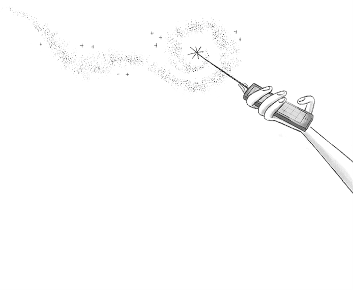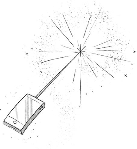 – Ну ладно, ничего не поделаешь. – Мама трижды топнула ногами, хлопнула в ладоши, покрутила попой, произнесла «маршмеллоу»… и –ПУФ! – сделалась феей. А потом схватила со стола свой Магопульт. Большую часть времени он выглядит как обычный телефон, но как только мамочка берёт его в руки, его экран начинает светиться, и он вытягивается в волшебную палочку. Мамочка говорит, что для того, чтобы Магопульт ожил, его должна коснуться настоящая фея.
