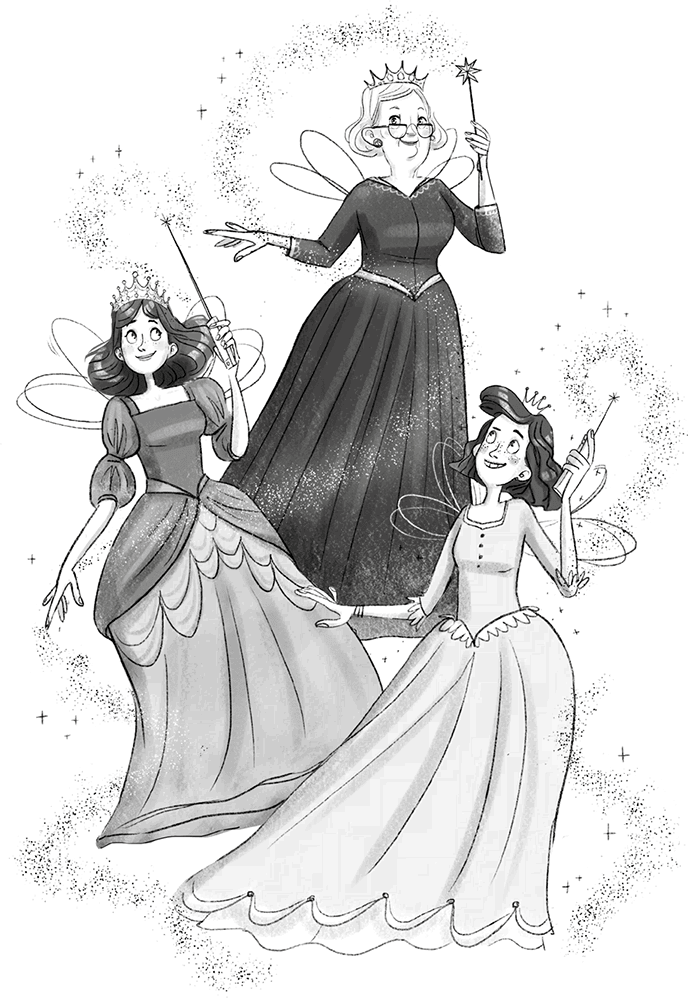 Моя тётя Джо и бабуля тоже умеют превращаться в фей, потому что в нашей семье все, кто рождается девочками, со временем становятся феями. Это значит, что все они могут летать, делатся невидимками и творить самое настоящее волшебство. Мамочка и тётя Джо вместо волшебных палочек пользуются современными Магопультами В‐5. У них отличная волшебная мощность, дисплей, как у компьютера, всякие полезные Волшебные приложения, Магопочта и даже Фейские игры!