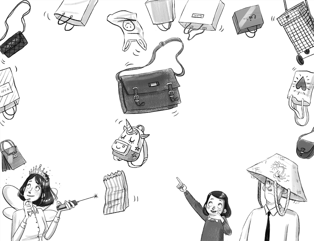 Облако было уже прямо над нами. Оно вздрагивало и колыхалось, где-то внутри него рокотал гром. А потом…Бу-буХ! Что-то грохнуло особенно громко, и с неба градом посыпались сумки – прямо на наш дом и сад. Каких сумок тут только не было! И маленькие театральные, и большие, для хозяйственных покупок, и бумажные. Среди них оказались даже клетчатая сумка-тележка, рюкзачок с единорогом и нарядная розовая сумочка с большой чёрной пряжкой.