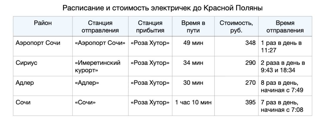 Электропоезд «Ласточка» – удобный и быстрый способ добраться до горнолыжных курортов Красной Поляны. В зависимости от станции отправления электрички ездят с разной частотностью. Например, из Аэропорта «Ласточки» ходят 1 раз в сутки. Это стоит учитывать при покупке авиабилетов и планировании выходных.