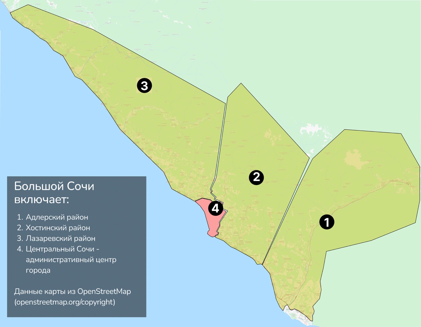Большой Сочи – совокупность Центрального, Хостинского, Адлерского и Лазаревского районов.