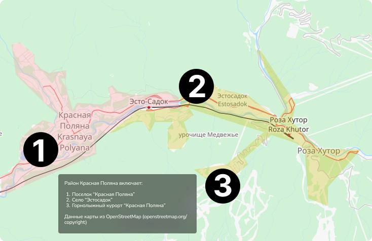 Район «Красная Поляна» – местное название для горной части Адлерского района, включающей поселок Красная Поляна, село Эстосадок, три горнолыжных курорта («Роза Хутор», «Газпром Поляна», «Красная Поляна») и село Медовеевка. Медовеевка упоминается отдельно, если речь идет о конкретной локации.