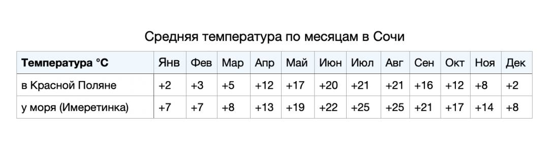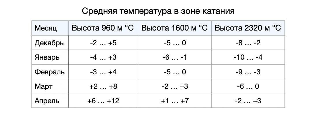 Горнолыжный сезон в Красной Поляне длится с декабря по апрель, но даты начала и завершения сезона зависят от снежного покрова, который формируется к декабрю, и погодных условий в апреле. Каждый месяц сезона отличается особенностями, которые стоит учитывать при планировании поездки. Температуру принято делить на три зоны катания: 960 м (базовый уровень), 1600 м (основная зона трасс) и 2320 м (верхние склоны, где снег сохраняется дольше всего). Для комфортного отдыха следите за прогнозами погоды на официальных сайтах курортов «Роза Хутор», «Газпром Поляна», «Красная Поляна» и специальных приложениях Yr.no и Snow Forecast. Последние 2 сервиса предоставляют данные в режиме реального времени.