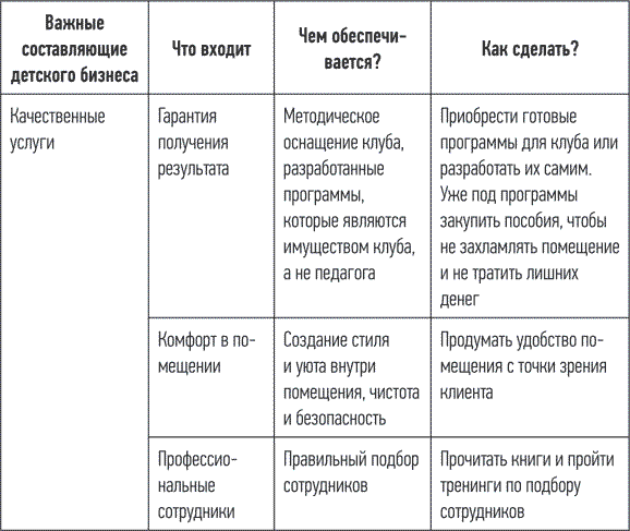 Внимательно изучите таблицу 2. Смотрите, как все просто. Клиент приходит в клуб, ему и его ребенку должно быть комфортно, удобно и безопасно. Но платит он деньги за оказание услуг. То есть клуб должен давать гарантированный результат. Как это обеспечить? Конечно, программами и профессиональными сотрудниками.