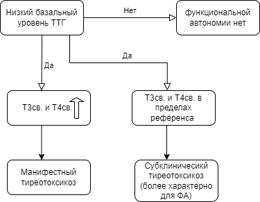 • При обнаружении сниженного уровня ТТГ дополнительно проводится определение уровня свободного Т4 и свободного Т3, при обнаружении повышенного ТТГ – определение уровня свободного Т4.