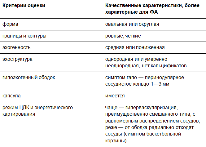 • компрессионная ультразвуковая эластография – отображение различия эластичности нормальной и патологической тканей на основе оценки локальной деформации при дозированной компрессии или вибрации. Для ФА характерно значительное усиление жесткости, вследствие этого интенсивное окрашивание, отличное от окружающей паренхимы