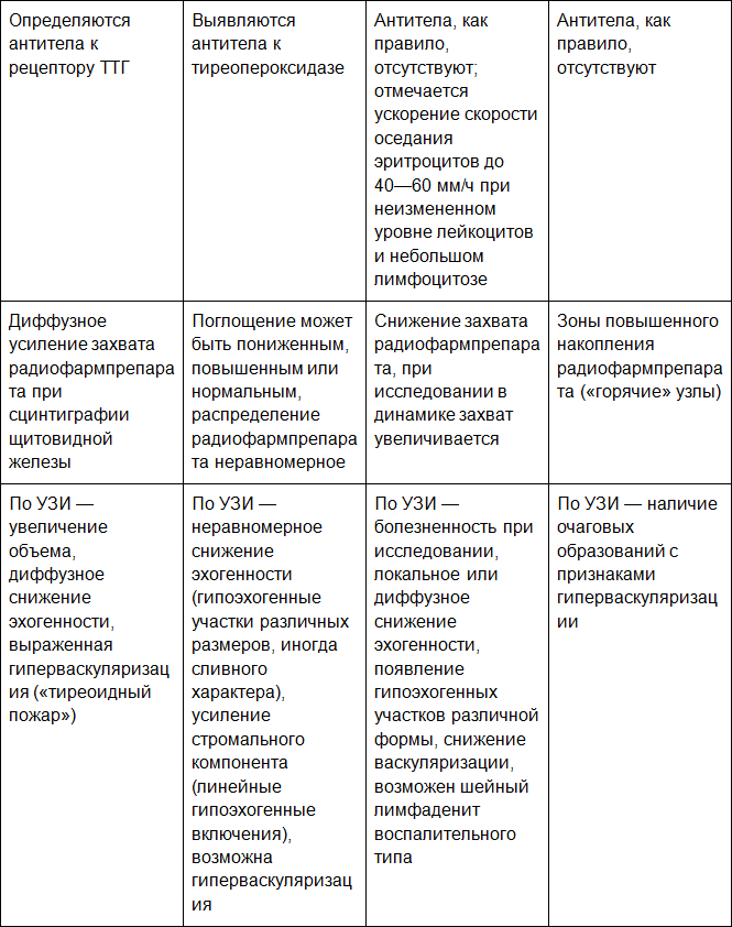 АТ-рТТГ, АТ-ТПО, как правило, отсутствуют (определяются с целью дифференциальной диагностики с диффузным токсическим зобом после оценки клинических проявлений и первичного гормонального исследования).