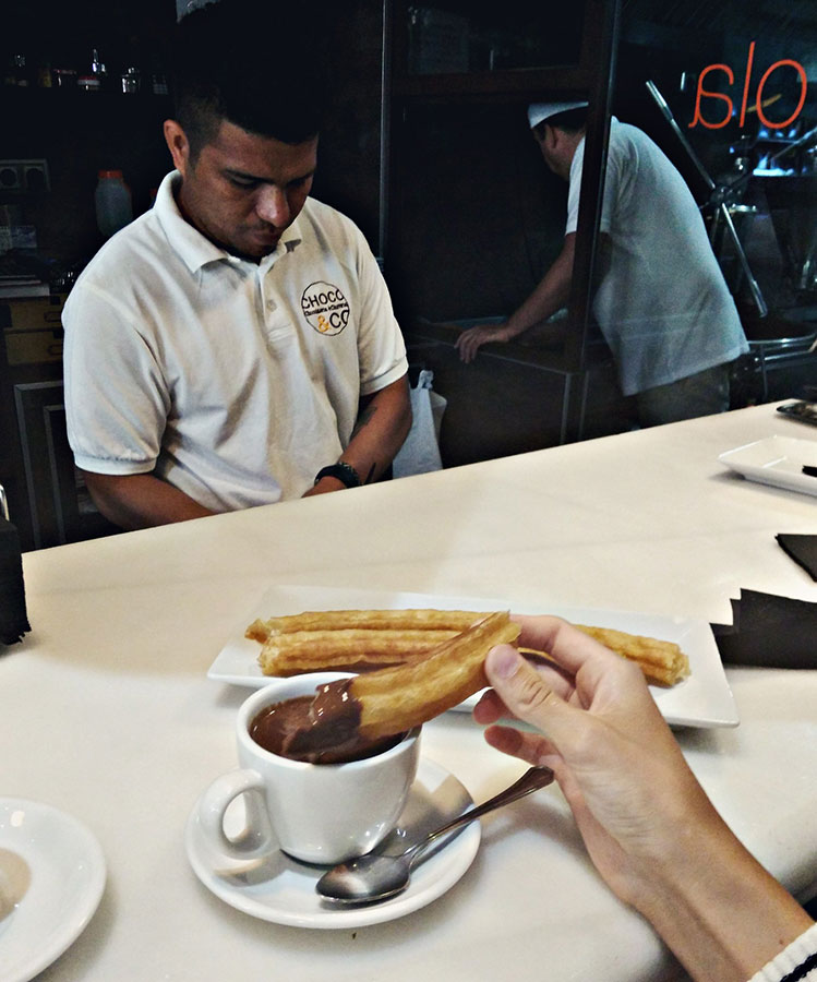 В девять утра мы все вместе выходим из дома в сторону метро, но по дороге наш новый знакомый предлагают зайти позавтракать. Мы заходим в небольшое кафе. Там нас угощают горячим шоколадом с традиционным испанским десертом. По вкусу похож на наши пышки, только в виде длинной палочки.