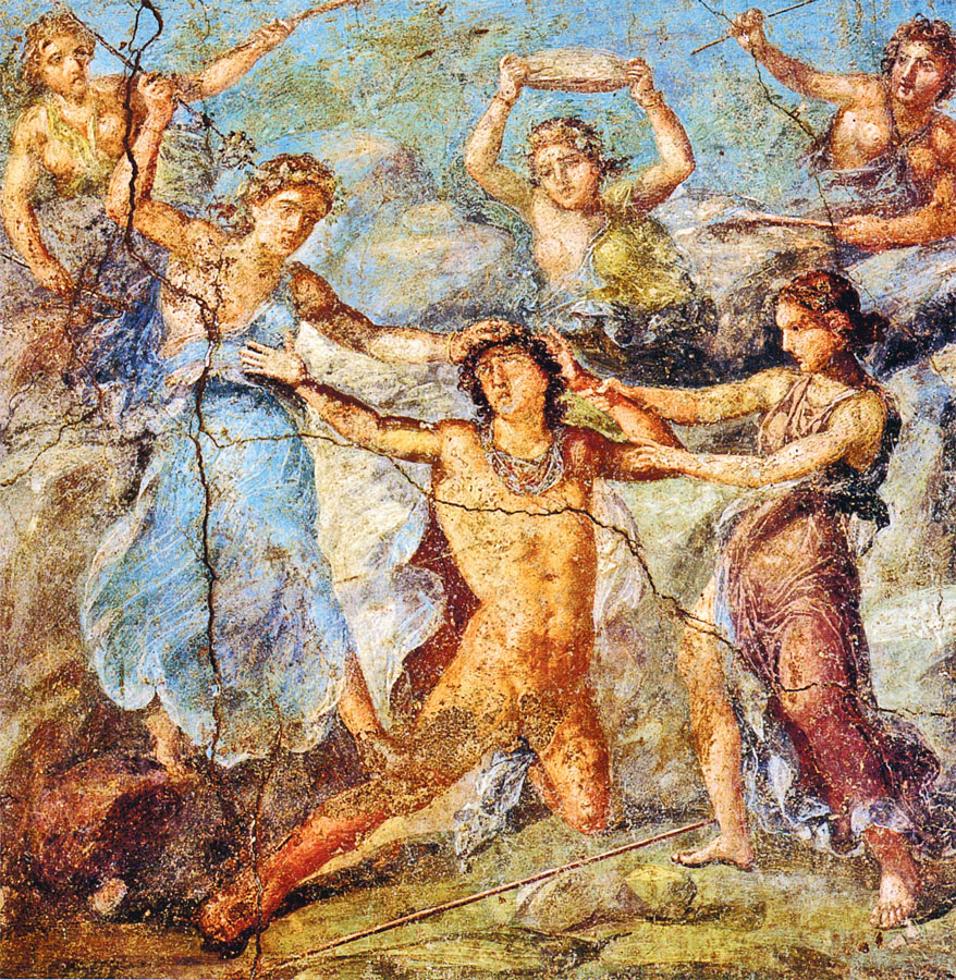 Одна из самых известных древнеримских фресок, найденных при раскопках Помпей, изображает обнаженного юношу – царя Пенфея. Он стоит на коленях среди менад – пьяных последовательниц Диониса, бога виноделия. Одна из них заносит над его головой тяжелый камень, две другие удерживают за руки и волосы. Его смуглое и сильное мужское тело контрастирует со светлой и, казалось бы, слабой женской плотью. Гармоничные яркие краски и легкие, практически импрессионистские мазки придают фреске почти праздничное настроение, диссонирующее с ее мрачным сюжетом – мгновением накануне кровопролития.