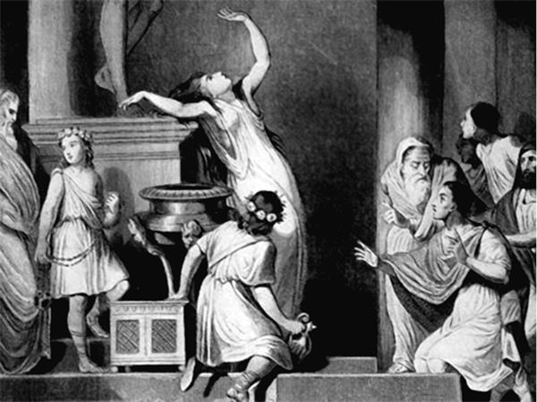 Сцена прорицания в Дельфийском оракуле. В центре – впавшая в транс прорицательница пифия, рядом с ней – девы-помощницы и те, кто пришел за советом