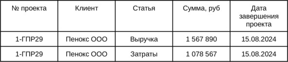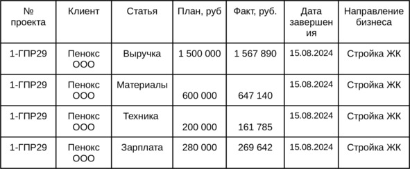 При такой структуре данных можно провести аналитику только по двум статьям: Выручка и Затраты. Если в управленческом учете фиксируются только суммарные затраты и доходы без детализации по статьям затрат, источникам дохода, временным периодам и видам работ, то анализ будет затруднен. Мы не сможем понять, из-за чего меняется рентабельность проекта.
