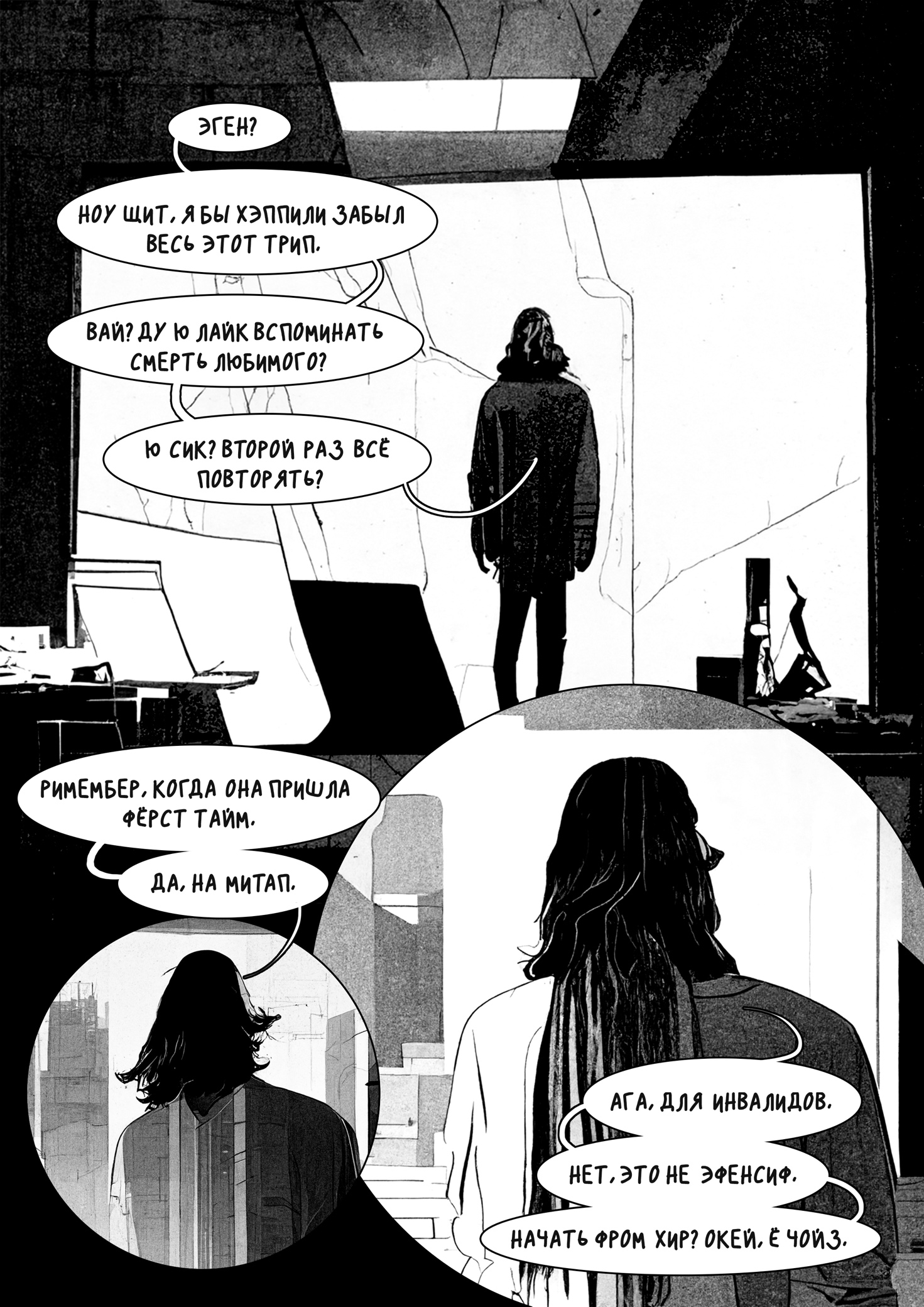 Сайленс. Знаю, это было руд, но я её по плечу похлопал. Совсем слайтли. Она отскочила, как от маньяка, и уставилась на меня своими глазищами. Глаза у неё были огромные, на пол лица, серые. Она их ещё чёрным карандашом обводила. Бровей из-за этого было почти не видно. Я потом только узнал, что она их обесцвечивала вместе с хайреом. В тот момент мне показалось, что у неё вообще на лице ничего, кроме глаз, нет.