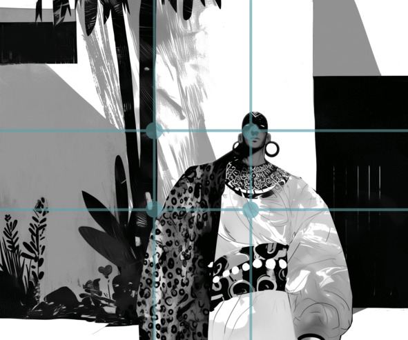 Можно подумать, что это просто середина изображения. Это не совсем верно. Когда мы смотрим на горизонт, наши глаза поднимаются чуть выше фактического центра формата. Горизонт делит его не пополам, а чуть выше середины. Поэтому и композиционный центр будет чуть выше середины листа. Самое простое, что вы можете сделать – это расположить все ваши объекты по центру с главным акцентом чуть выше середины. Если вы рисуете портрет или фигуру в интерьере, располагайте их по центру, голову в верхней части формата.