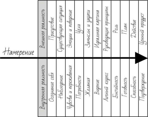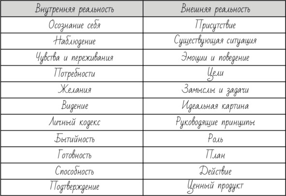 Как вы видите, в таблице 11 строк и 2 столбца. Она построена на той же схеме, которую я уже показывал. Левый столбец – внутренняя реальность, правый – внешняя. С левой стороны в представленной таблице перечислены те состояния, которые вы ощущаете у себя внутри. С правой – то, что можно наблюдать и измерять. Если провести стрелку посередине таблицы в направлении сверху-вниз, то это будет направление, куда движется намерение.