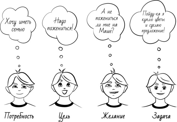 У меня может быть потребность иметь семью. Потребность – общая и универсальная. Тогда я смогу сформулировать цель – «пожениться». Цель – всегда абстрактная. Определив потребность и цель, я могу еще больше конкретизировать. Так я формулирую желание – «иметь семью с Машей». В желании больше конкретики. Я понимаю, что я не просто хочу жениться, а на ком-то определенном. И когда я понял, чего хочу, время формулировать задачу. Ей может быть – «купить букет, кольцо и пойти к Маше с предложением».