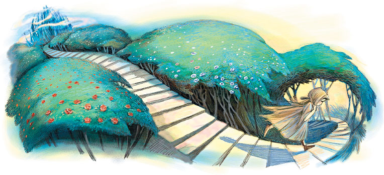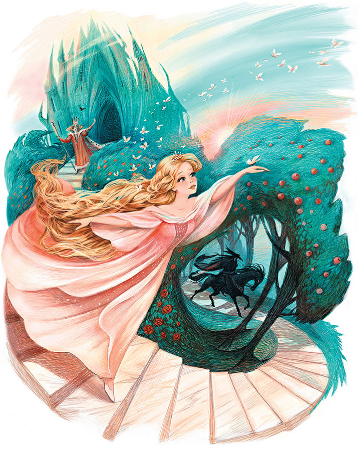 Широкая мраморная лестница полукругом спускалась в сад. Вскоре послышался стук лёгких каблучков, и по ступеням сбежала принцесса Мелисенда.
