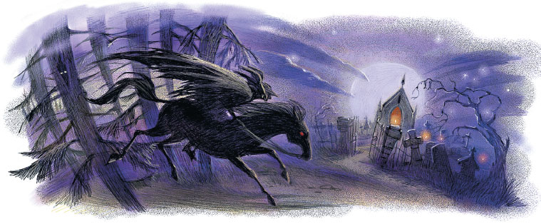 Вдруг, словно выскользнув из ночного мрака, над садом появился стремительно летящий человек в чёрном плаще, наполненном ветром. На его плече сидел, вцепившись когтями, большой ворон. Он изредка взмахивал крыльями, чтобы удержаться.
