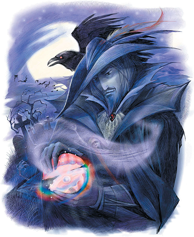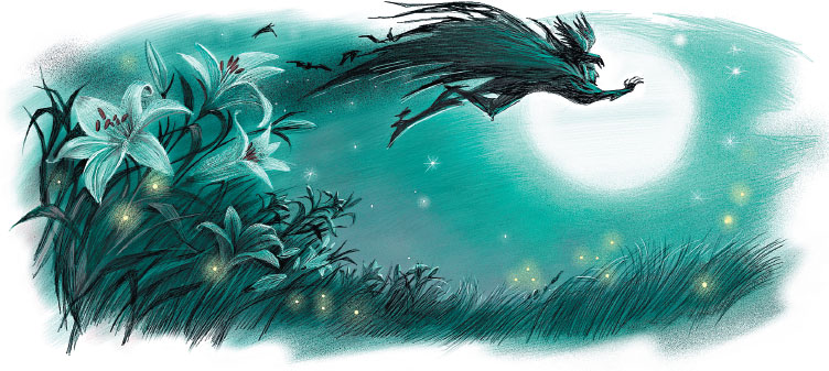 Луна на миг осветила бледное, зеленоватое лицо графа Мортигера. Всюду, куда падала тяжёлая тень его плаща, замолкали птицы, цветы закрывали свои венчики. Всё погружалось в глухой, непробудный сон.