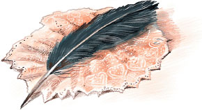Придворный Воробей уселся на спинке постели. Среди смятого кружева и шёлка он вдруг увидел чёрное, словно обугленное, перо.