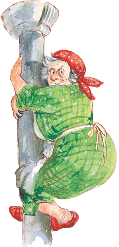 На пожарной лестнице, почти под самой крышей, стояла маленькая старушка. Белые волосы выбились из-под платка с розовыми цветочками. Голубые глаза горели. А сатиновый передник развевался по ветру, как пиратский флаг.