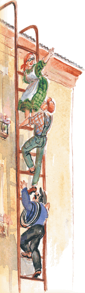 Немного ниже её, на пожарной лестнице, стоял человек с бледным лицом и протягивал к ней то одну, то другую руку.