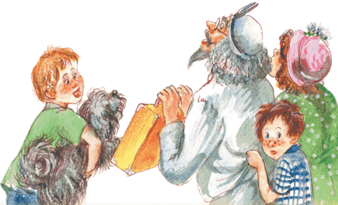 Детский Доктор влетел в большую толпу, которая стояла прямо посреди улицы. Он чуть не сбил с ног высокую тётю в ярко-красной шляпе и какого-то рыжего мальчишку. Рыжий мальчишка стоял, задрав голову кверху, и держал не поймёшь что на верёвочке. Это было что-то серое и настолько мохнатое, что не было видно ни глаз, ни ушей.