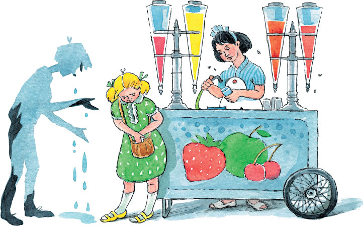 Тень беспомощно оглянулась и вдруг увидела Люсю Веткину, которая вместе со своей тенью остановилась у киоска с газированной водой. В киоске хорошенькая продавщица в твёрдой белой наколке равнодушно пересчитывала мокрые монетки.