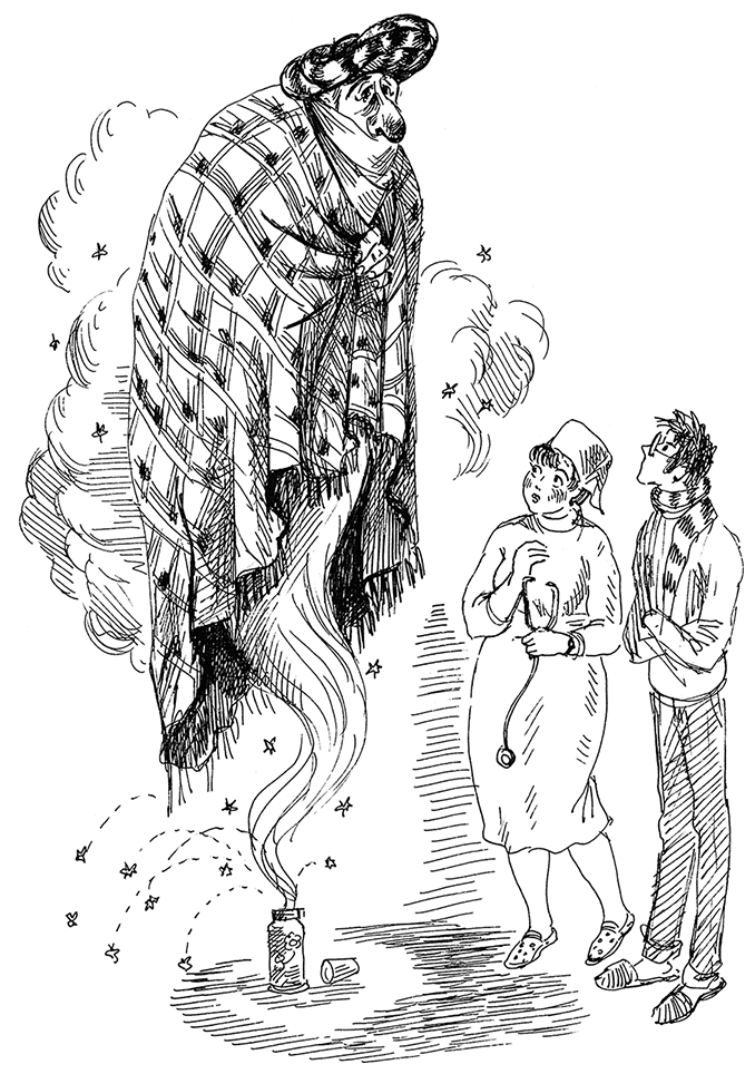 – Я все понял, – наконец, рыдая, проговорил он. – Ты решил бросить волшебство и стать врачом с румяными щеками. Но сначала хочешь уморить меня. Конечно, я тебе в тягость, я связал тебе руки. Лучший способ избавиться от старого, никому не нужного джинна – это сжечь его горчичниками, чтоб от него осталась только жалкая горстка пепла!