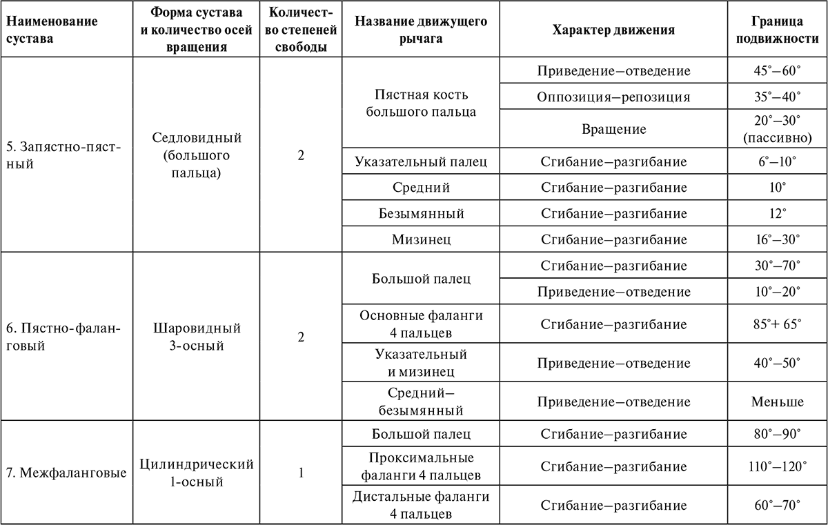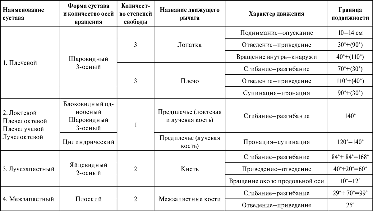 Для того чтобы представить все изложенное в наглядном схематическом виде, мы приводим в виде иллюстрации к сказанному таблицу, в которой перечислены все суставы верхней конечности и указана по отношению к каждому суставу его форма, количество доступных ему степеней свободы, характер производимых им движений и количественное выражение границ их подвижности. В биомеханике принято изображать границы подвижности с помощью построения так называемых глобусов подвижности, дающих совершенно наглядное представление о подвижности отдельных суставов и о всех размерах любых движений. Мы ограничимся здесь только соответствующей таблицей (см. таблицу 1).