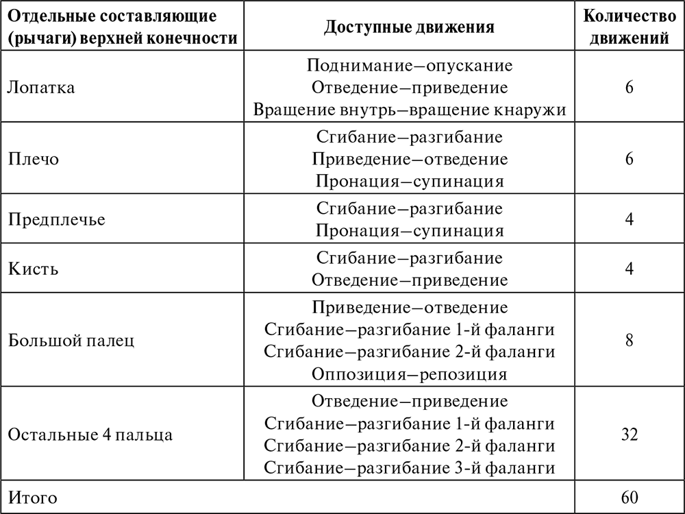 Первый вопрос, возникающий при рассмотрении работы двигательного аппарата, заключается в следующем: сколькими и как расположенными по отношению к суставу мышцами осуществляется то или иное движение? Мы знаем, что все мыслимые движения верхней конечности, включая сюда и функционально связанные с ними движения плечевого пояса, сводятся в конечном счете к совершенно определенным движениям сгибания, разгибания, приведения, отведения, вращения и к комбинациям этих движений. Если перебрать все это многообразие движений и вычленить основные, относя их к системе пространственных координат, то их окажется в основном для верхней конечности, включая и плечевой пояс, – 60 (см. таблицу 2). Нетрудно понять, какое бесчисленное множество комбинированных движений можно образовать из этих 60 элементов.