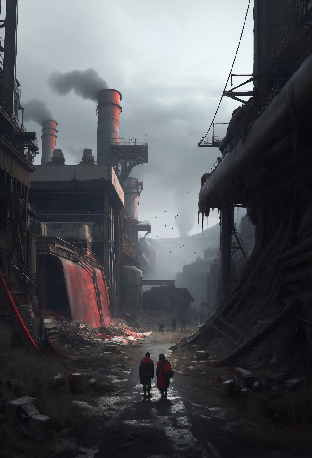 Рисунок 2 «Немногочисленные заводы умирающего города всё ещё держат его экономику на плаву. Но ценой становятся жизни и сумасшедшие выбросы. Условия работы – адские, однако из-за того, что тут ещё более-менее платят, люди стремятся сюда попасть. Многие думают, что лучше хоть как-то недолго жить, чем выживать всю. жизнь».