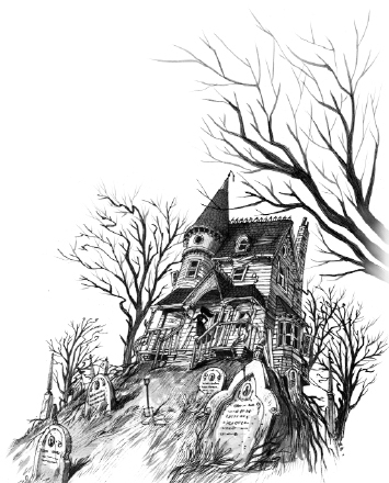 In the middle of the thickest batch of tombs stood 1 Graves Hill. The house wasn’t boarded up or bolted shut like the cottages by the lake, but that didn’t make it any more inviting. The steps leading up to the porch glowed mildew green. Dead birches and vines wormed their way around dark wood, and the sharply angled roof, black and thin, loomed like a witch’s hat.