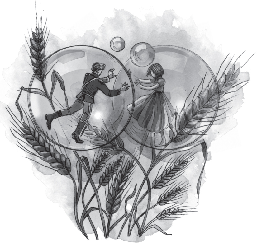 A royal garden gleamed beneath a sunset, Camelot’s castle silhouetted against the pink and purple sky. Masses of well-dressed spectators gathered, the people and creatures of the Woods watching something attentively, something neither Tedros nor Agatha could make out, since the crowd was obscuring it. But there was something else in the painting, foregrounded and sharply clear, floating over the mob: a pair of watery bubbles, each the size of a crystal ball, two tiny figures enclosed within.
