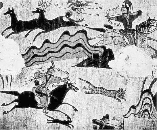 Настенный рисунок из комплекса гробниц Когурё, расположенного в городах Пхеньян и Нампхо. Охотник, изображенный в верхней правой части, развернулся корпусом на 180 градусов, опустил поводья и целится из лука. Так уверенно чувствовать себя в седле и результативно стрелять на скаку мог только кочевник, который верхом на лошади проводил больше времени, чем на ногах