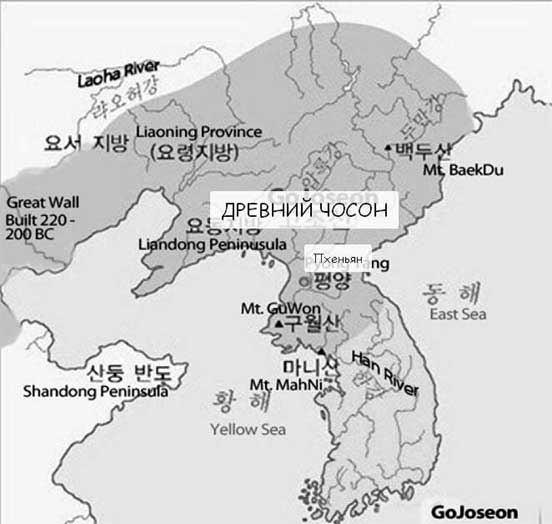 Подзаголовок таит в себе глубокий смысл. Речь идет не о «первом корейском государстве», а о «первом государстве на Корейском полуострове». И это неспроста. Корейцы привыкли вести отсчет своим национальным государственным образованиям с Чосона, к названию которого в наше время добавляют слово «древний», чтобы отличать его от другого, более позднего Чосона, существовавшего с 1392 до 1897 года. Но нет достоверных данных о том, что Древний Чосон был именно корейским государством. Частичное расположение на Корейском полуострове не делает автоматически Чосон корейским, что бы там ни утверждали некоторые историки, которым непременно нужна корейская принадлежность Чосона[7].