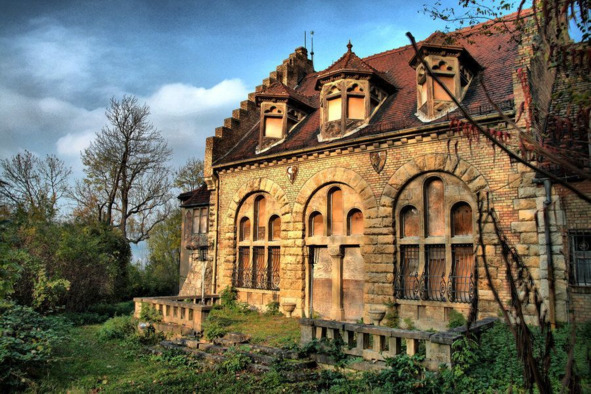 Он никогда не видел его так близко, но он не обнаружил ничего, что изменило бы его мнение. Серая шиферная крыша была образована – или, скорее, деформирована – серией остроконечных фронтонов. Двое из них располагались в передней части дома, а справа находился третий, за которым торчал меньший, по-видимому, ведущий к задней части. Фронтон был украшен решеткой из дерева и окрашен в мрачный зеленый бутылочный цвет. В других частях дома штукатурка между балками отслаивалась, обнажая кирпичную стену. Плющ, того же зеленого оттенка, разросся и покрыл своими плоскими листьями от подножия окон первого этажа до самых высоких фронтонов. Отдельно висела одна из решеток. Виноградная лоза взобралась туда и вросла в измельченную стену, чтобы оторвать раму кирпичного окна.