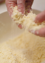Keeping everything as cold as possible (including bowls, hands and ingredients) makes for the best pastry. That said, I have a warm kitchen and warm hands, supposedly two of pastry’s biggest enemies, but I still manage to make perfectly decent pastry. Some people suggest putting everything in the fridge for an hour before starting. If the fat becomes too warm it will melt and be absorbed into the flour too much, which prevents the flour from absorbing enough water, and the result is pastry that’s too crumbly and difficult to roll. This is particularly the case if you are working with a pastry with a high fat content, like puff pastry.