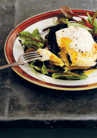 You should poach the eggs for about 3 minutes if you want them soft in the middle (5 if you want them stern and unyielding). Drain them, put them on top of your crumbly goat’s cheese/mushroom mix, scatter some chopped tarragon on the top, grind on a bit of pepper, and voilà!