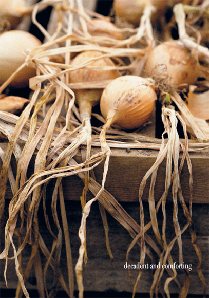 Purists will argue this is nothing like the real thing, which should be made with beef stock and have a great molten island of bread and cheese on top. I use vegetable stock and lose the bread—it’s not as heavy, yet still as decadent and comforting. The trick is slooooooooow cooking the onions, so they impart their rich caramelly flavour to the soup. A drizzle of good balsamic vinegar also gives it a rich enigmatic taste, perfect for a blowsy autumn day.