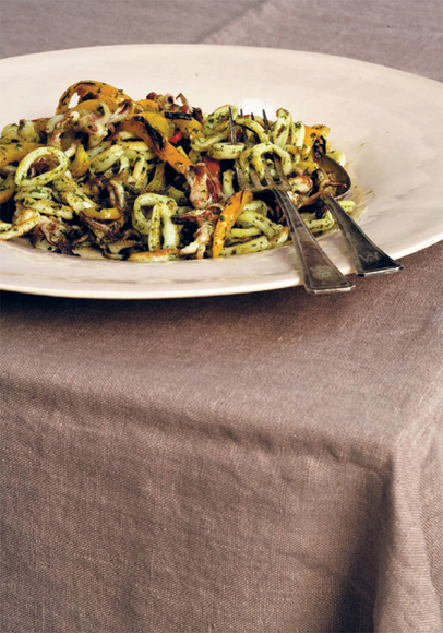 Put the coriander/cilantro, basil, oil, garlic and lime juice into the blender and blend on high. If necessary, add a bit more lime juice. Pour over the squid and peppers and serve.