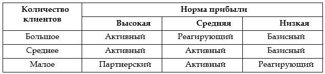 В зависимости от наличия и сочетания критериев прибыльности и масштабности клиентов, взаимоотношения персонального менеджера с клиентом могут строиться на следующих уровнях: