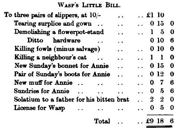 “Ahem!” said the parson. “I’ll read you one or two casual items of Wasp’s bill, and then you can judge for yourself how he is getting on.”