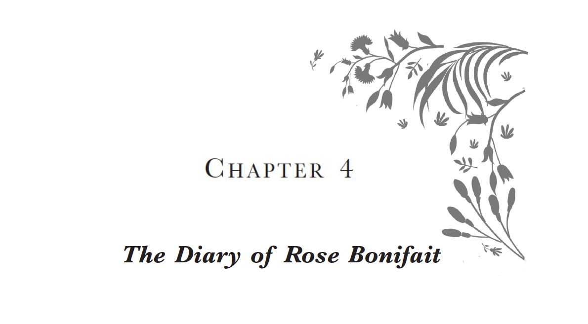 I got out of the bath, towelled myself down and went and got my phone. I turned on the torch function and squinted inside the hidey-hole. At first I thought there was nothing inside at all – it looked entirely empty. But then I saw something sitting on the bottom of the cupboard. I picked it up and dusted it off. It was a book, wrapped in an ancient cloth-cover. Inside, where time hadn’t faded it, the cloth was dark brown but the exterior had been bleached like bone to grey, and on the front it was imprinted with three dark blood-red gilded letters – MRB. Later, I would discover that they were initials and the M stood for Marie. It was her first name, although no one knew her as Marie; everyone always called her Rose. Rose Bonifait. And the book I had just discovered in the secret chamber that day was her diary.